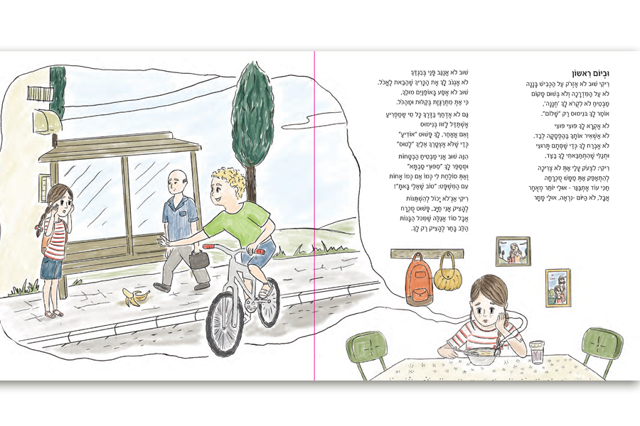 הספר מתאר שגרה שבועית של ריקי בו כל יום היא חווה דברים שונים, חלקם אמיתיים וחלקם פרי הדמיון. נהנתי מאוד לאייר את דמותה המתוקה של ריקי, הנצבת במצבים לא נעימים, יחד עם זאת שומרת על עולמה הדמיוני שמגן עליה מהעולם החיצוני. אחד האתגרים בספר היה ליצור אוירה של שנות ה-80 בארץ, לשם כך עשיתי מחקר ובדקתי כיצד הדברים היו נראים. כמו כן בחרתי בצבעוניות עדינה המדמה צבעי עפרון על מנת לחזק אוירה זו.